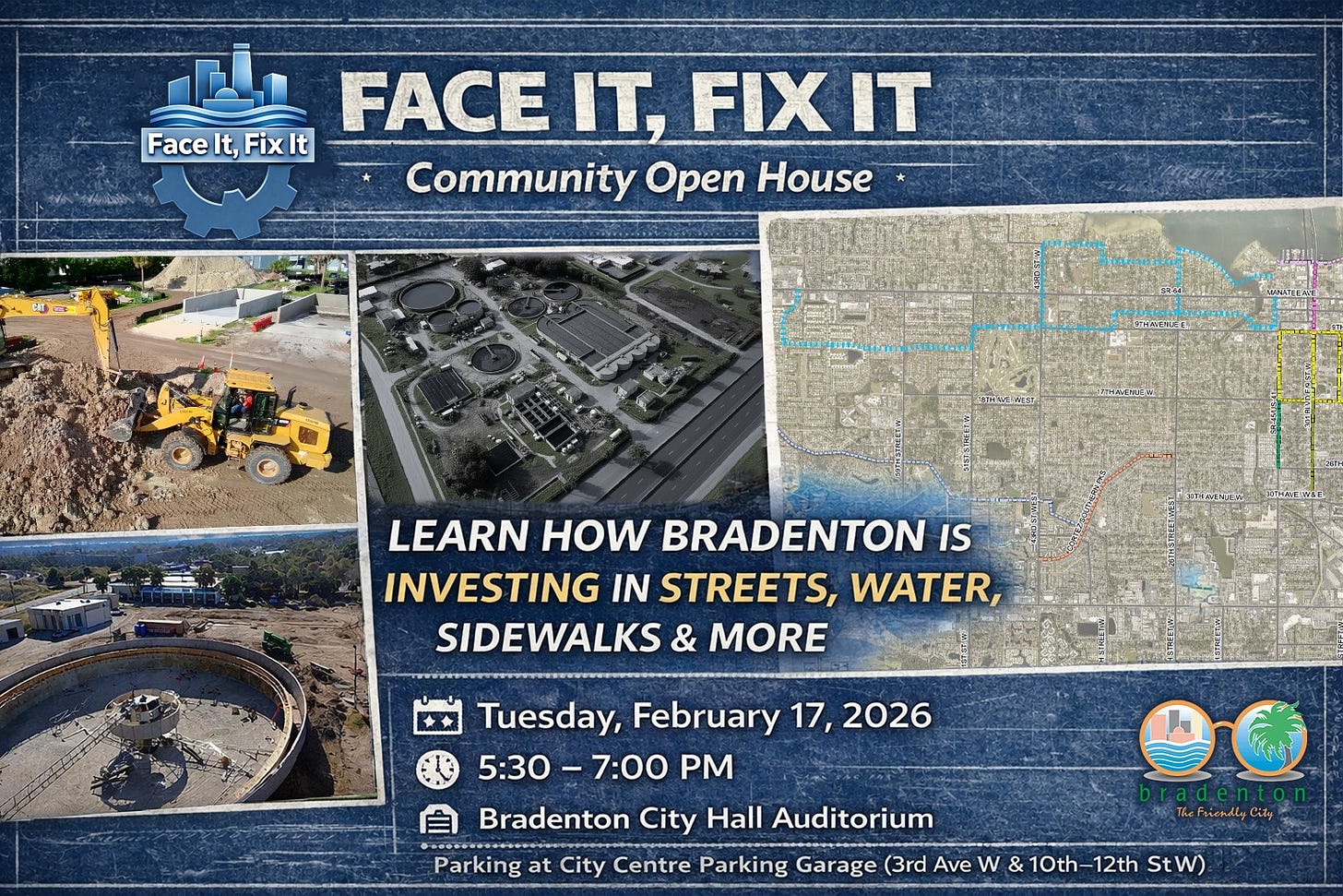 The Face It, Fix It Community Open House will be held Tuesday, February 17, 2026, from 5:30 to 7:00 p.m. at the Bradenton City Hall Auditorium, located at 101 12th St. W. Parking will be available at the City Centre Parking Garage on 3rd Avenue West between 10th Street West and 12th Street West.
