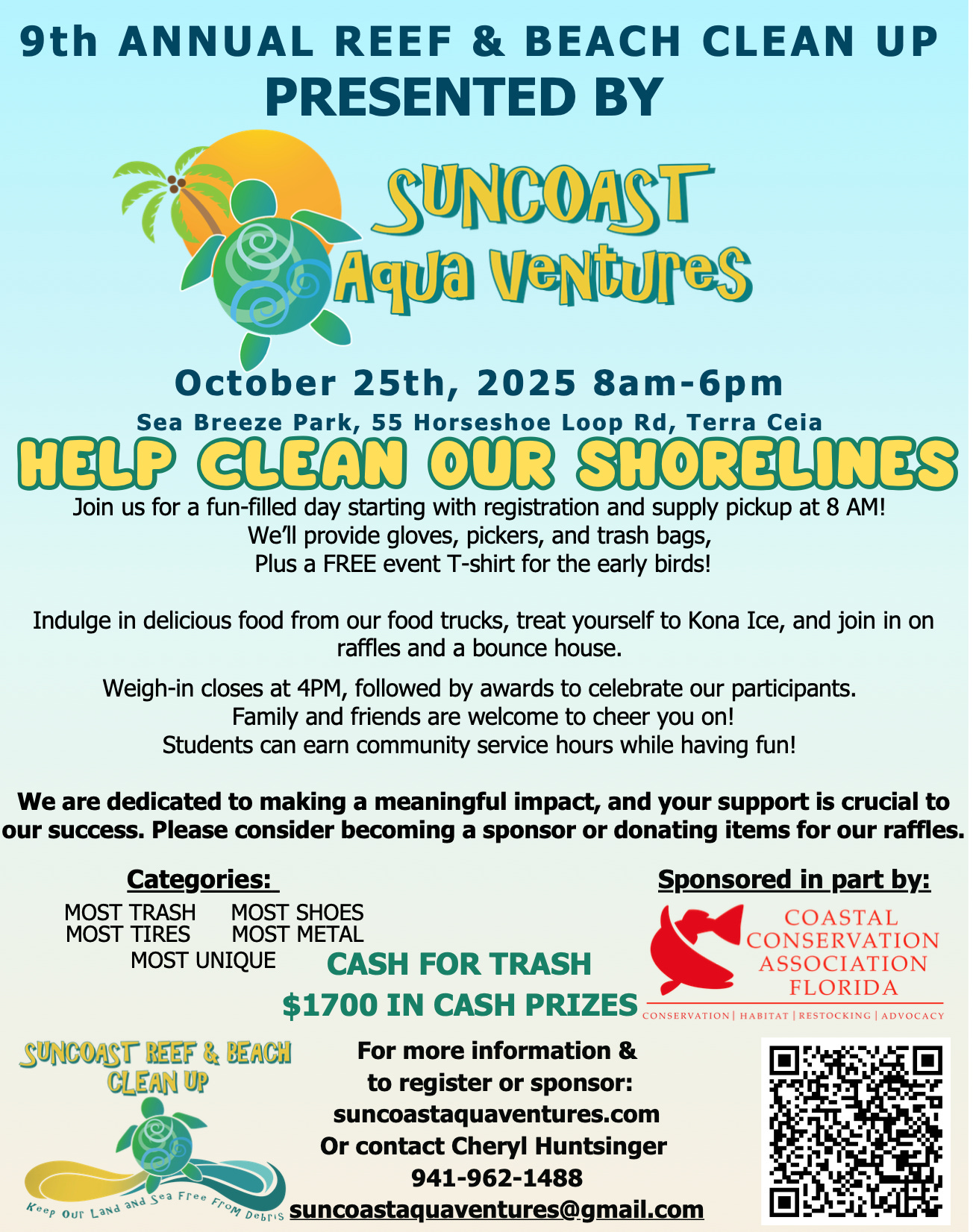 Help preserve local waterways during the 9th Annual Reef & Beach Cleanup on Saturday, October 25, 8 a.m.–6 p.m., at Sea Breeze Park (55 Horseshoe Loop Rd., Terra Ceia). Volunteers receive supplies, T-shirts (while supplies last), and can enjoy raffles, food trucks, and family fun.