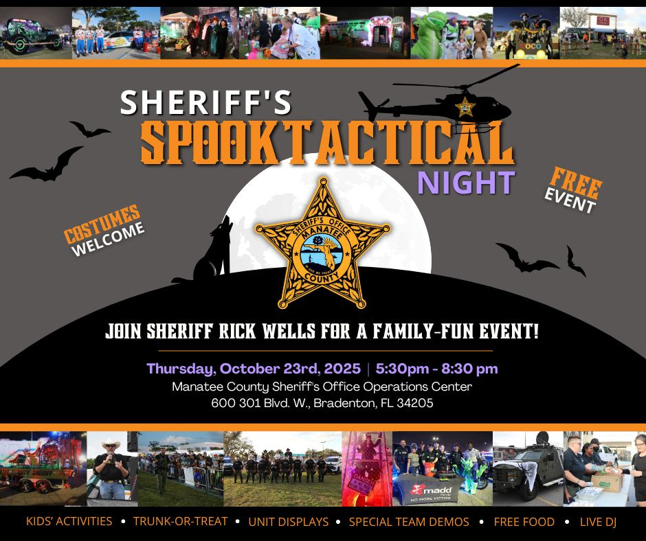 The Manatee County Sheriff’s Office hosts its annual Spooktactical Night on Thursday, October 23, from 5:30–8:30 p.m. at its Operations Center (600 301 Blvd. W, Bradenton). Families can enjoy trick-or-treating, unit demos, food trucks, and free hot dogs and water while supplies last.