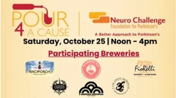 On Saturday, October 25, from 12–4 p.m., Flamingo Bay Brewing (1910 14th St. W., Bradenton) hosts a beer-tasting fundraiser for the Neuro Challenge Foundation for Parkinson’s. Tickets are $35 and include tastings, music by the Divebombers, and food truck fare.