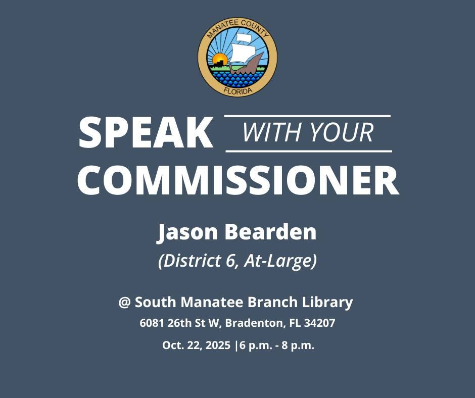 Commissioner Jason Bearden will host a community conversation on Wednesday, October 22, from 6–8 p.m. at the South Manatee Branch Library (6081 26th St. W., Bradenton). The session invites residents to share questions, feedback, and concerns directly with their at-large county representative in an informal setting.