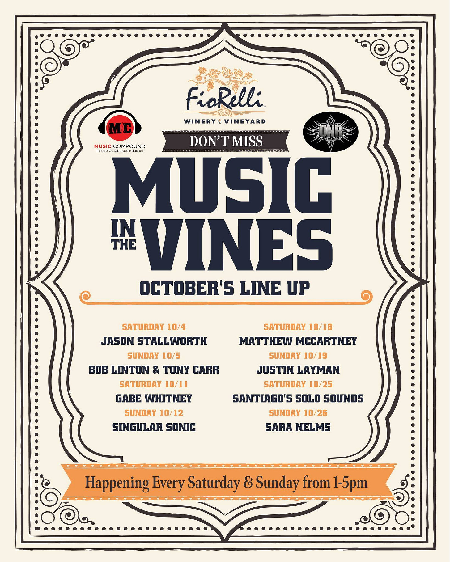 Enjoy wine, sunshine, and live local music in East Manatee. On Saturday, October 25, Santiago’s Solo Soundsperforms from 1–5 p.m., followed by Sara Nelms on Sunday, October 26.