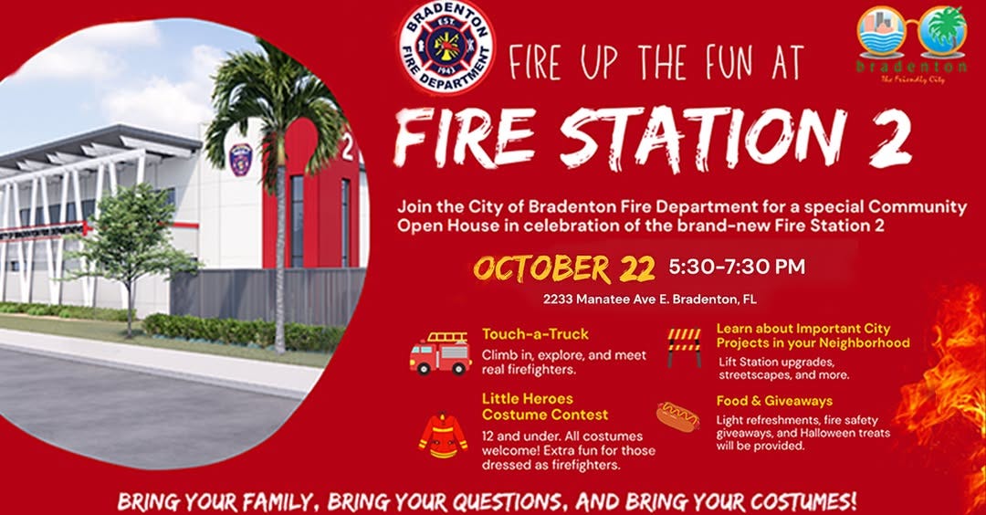Also on October 22, the City of Bradenton will celebrate the grand opening of its new Fire Station 2 at 2233 Manatee Ave. E. The free, family-friendly event runs from 5:30–7:30 p.m. and includes Touch-a-Truck activities, a Little Heroes costume contest, refreshments, giveaways, and city project displays.