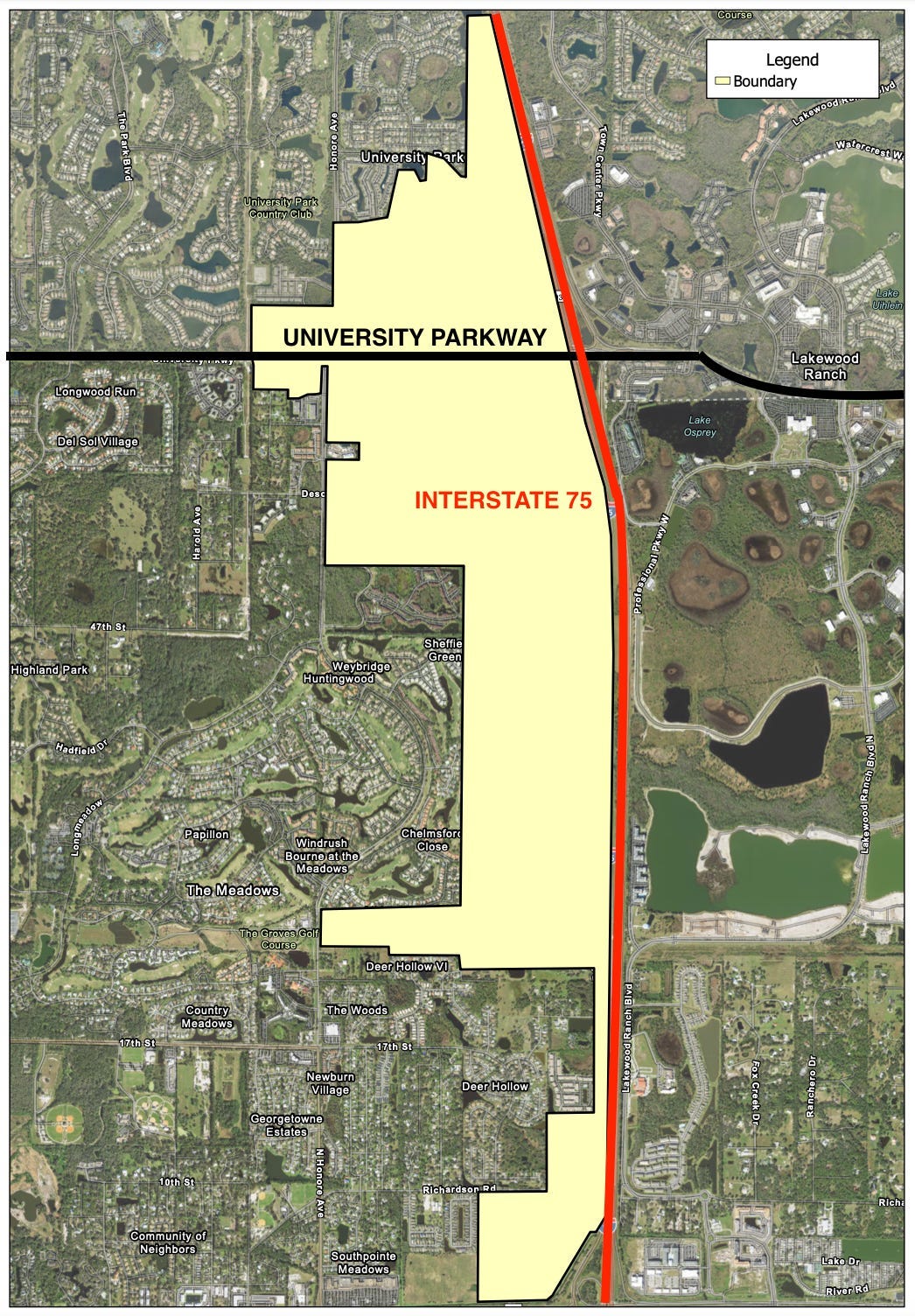 The district’s boundaries would extend from University Park in Manatee County south to Fruitville Road in Sarasota County, covering land west of Interstate 75 and including areas surrounding the University Town Center shopping corridor.