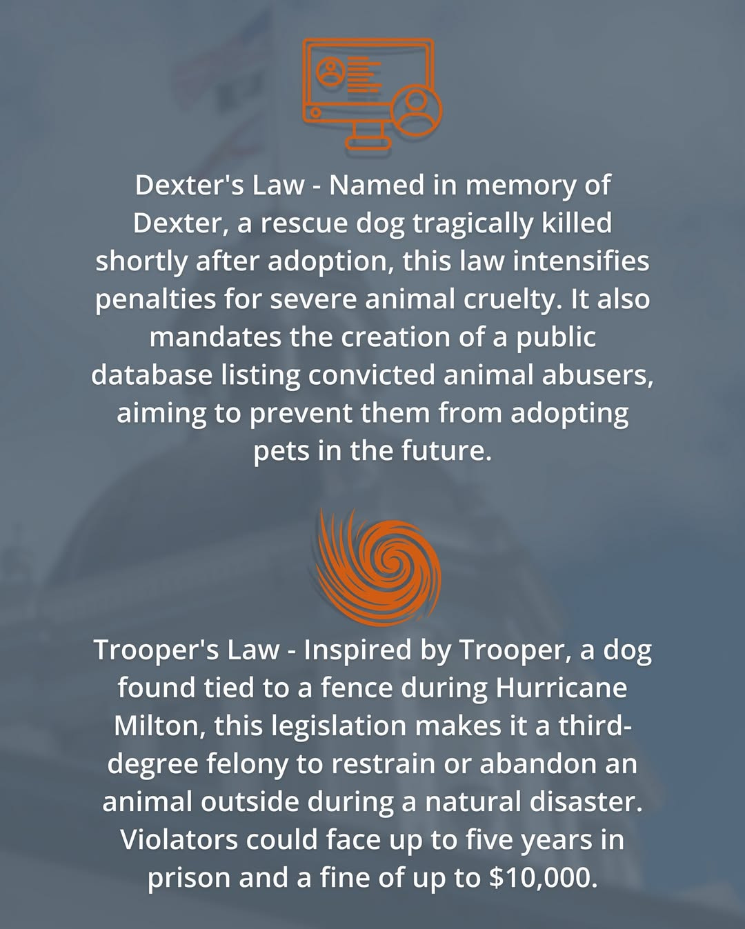 In addition to Dexter’s Law, Florida has enacted Trooper’s Law, inspired by Trooper, a dog found tied to a fence during Hurricane Milton. The legislation makes it a third-degree felony to restrain or abandon an animal outside during a declared natural disaster. Violators could face up to five years in prison and fines of up to $10,000.