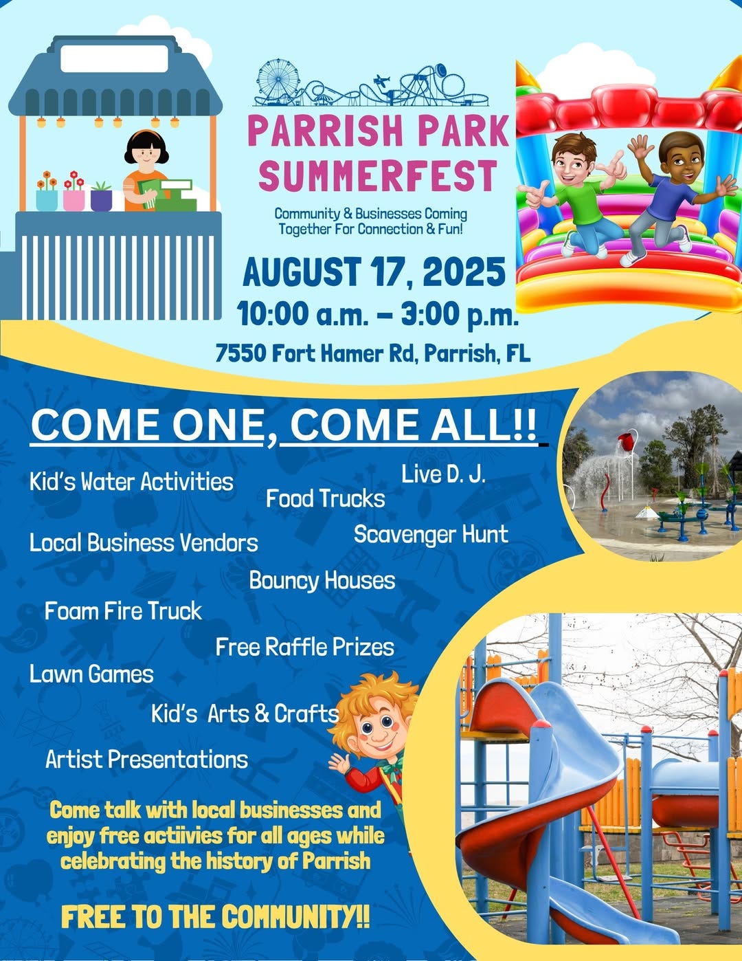 Sunday, August 17 – The Parrish Park Summerfest takes over Fort Hamer Park from 10 a.m. to 3 p.m. This free community event includes kids’ water activities, bouncy houses, lawn games, food trucks, a foam fire truck, live DJ, local vendor booths, artist presentations, and raffle prizes.