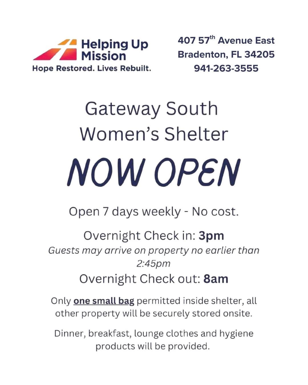 A new resource for women experiencing homelessness has officially opened in Bradenton with the launch of the Gateway South Women’s Shelter, operated by Helping Up Mission.