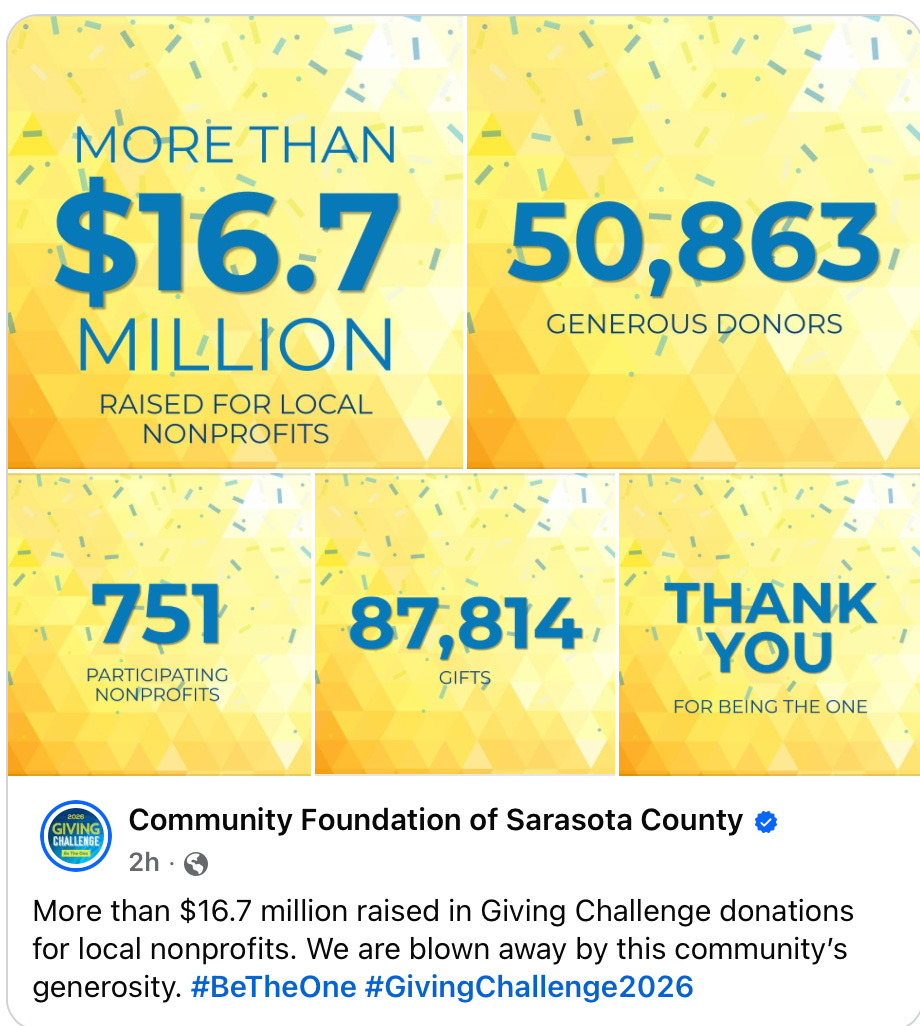 The 2026 Giving Challenge concluded with a powerful show of community support, raising more than $16.7 million for local nonprofits across Sarasota, Manatee, Charlotte, and DeSoto counties.