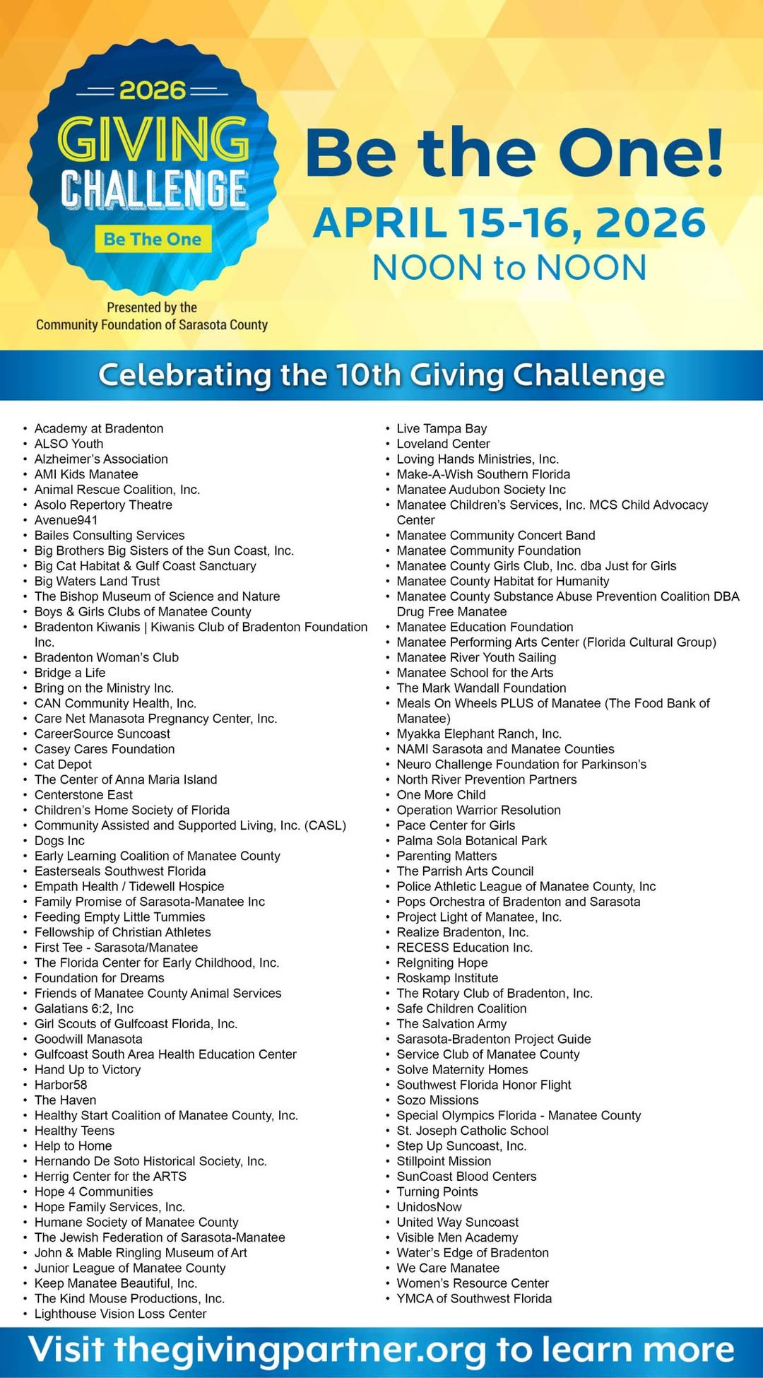 A 24-hour wave of generosity is set to begin as the 2026 Giving Challenge kicks off from noon April 15 through noon April 16, uniting communities across Sarasota, Manatee, Charlotte, and DeSoto counties in support of hundreds of nonprofit organizations.