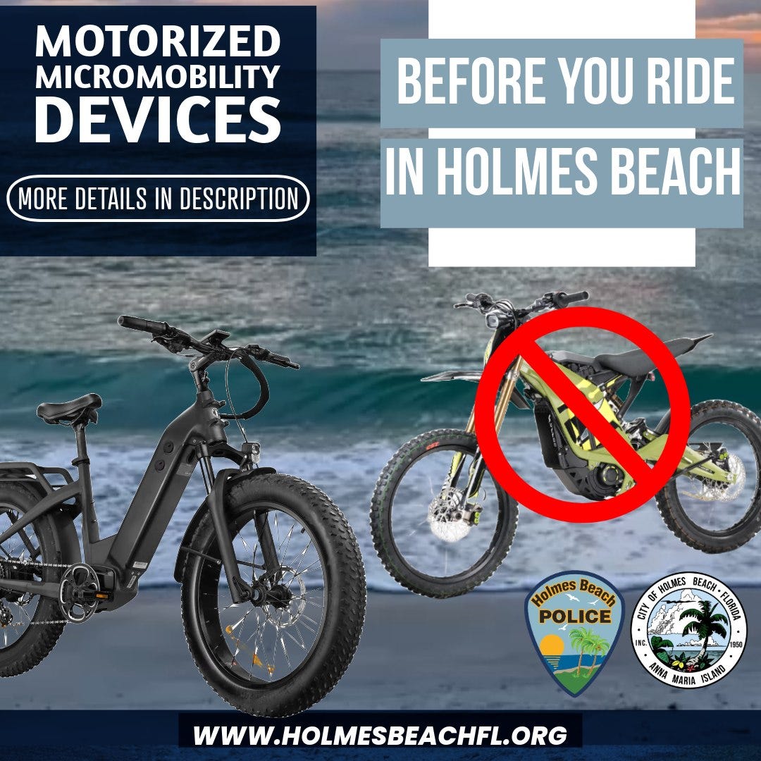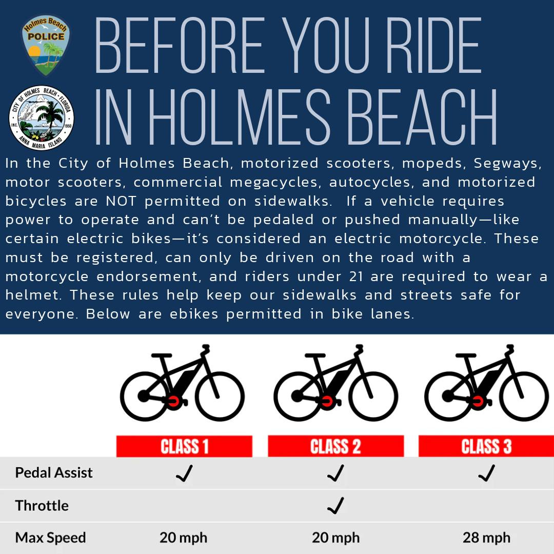 HOLMES BEACH — As electric bikes and other motorized devices gain popularity, the City of Holmes Beach is stepping up enforcement and awareness efforts to ensure riders stay safe — and compliant with the law — on local roads and sidewalks.