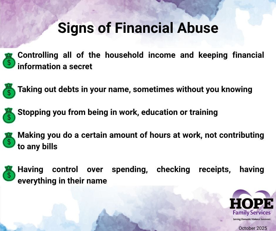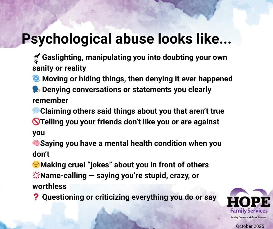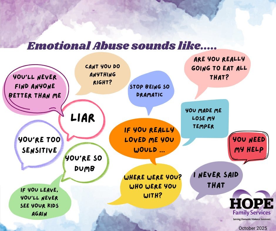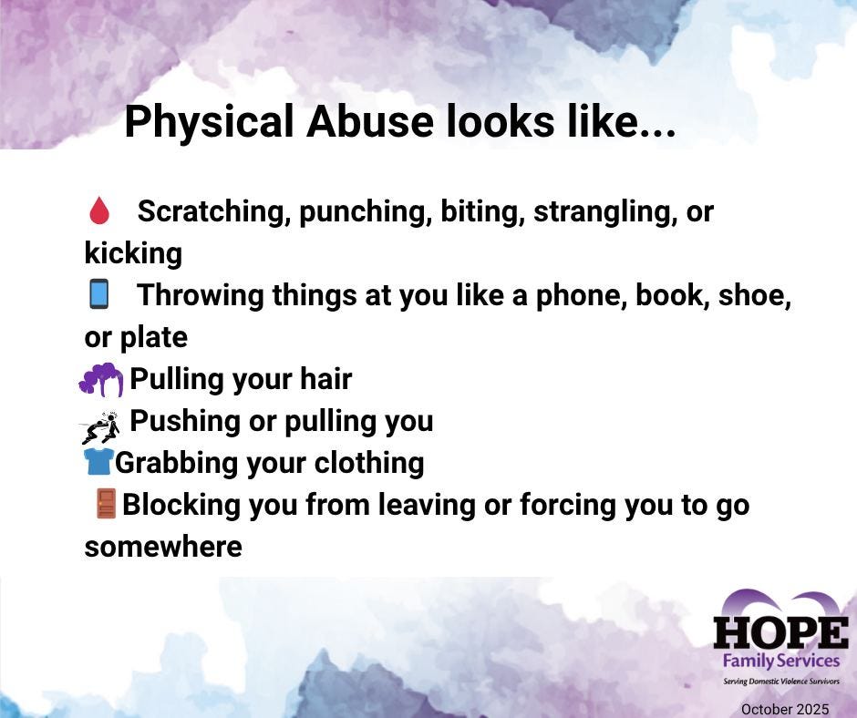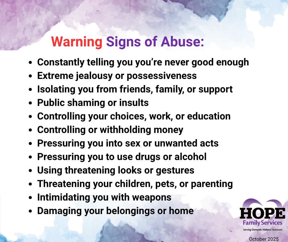 Throughout October, HOPE Family Services is observing Domestic Violence Awareness Month by educating the community about the many forms of abuse and the resources available to those in need. The organization’s awareness campaign features a series of informational materials that highlight how abuse can appear in different ways, from psychological and emotional manipulation to financial control, intimidation, and isolation.
