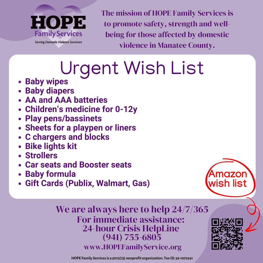 Community members can support shelter families by purchasing items through HOPE’s Amazon wish list or by donating in person. Donations can be dropped off at the HOPE Chest, located at 1215 8th Ave. W. in Bradenton, Tuesday through Saturday from 10 a.m. to 3 p.m. Those with questions or seeking additional information can call 941-747-8499.