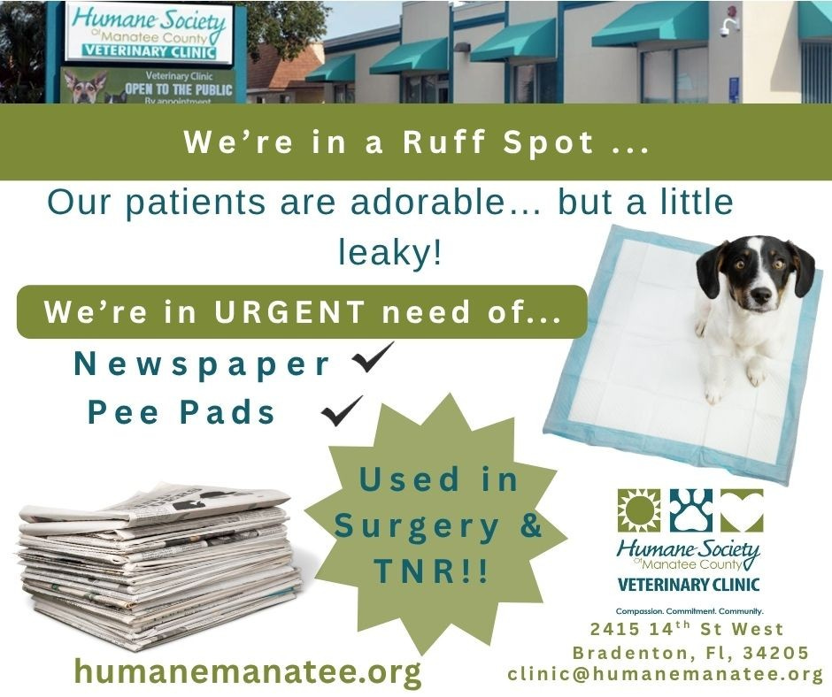 The Humane Society of Manatee County (HSMC) is asking for community assistance as its veterinary clinic faces an urgent need for newspapers and potty pads. These essential items are used daily to help keep patients clean and dry during surgeries and Trap-Neuter-Return (TNR) procedures.