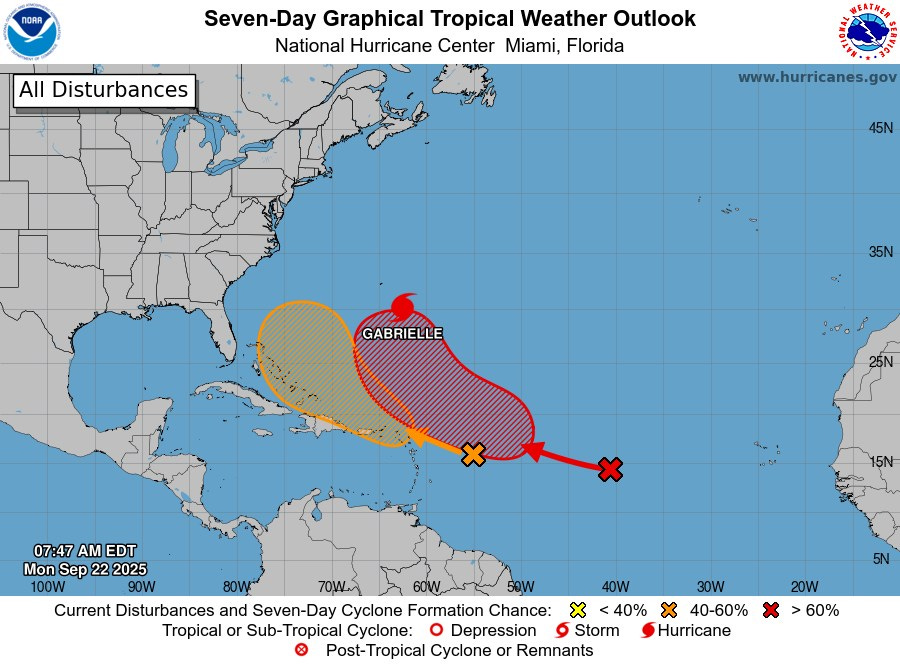 Behind Gabrielle, a tropical disturbance highlighted in orange has a 10% chance of development within the next 48 hours. A second system, marked in red, carries a 20% chance of formation within 48 hours and a 70% chance within the next seven days. While neither system currently poses a risk to Manatee County, officials stress the importance of staying alert during peak hurricane season.