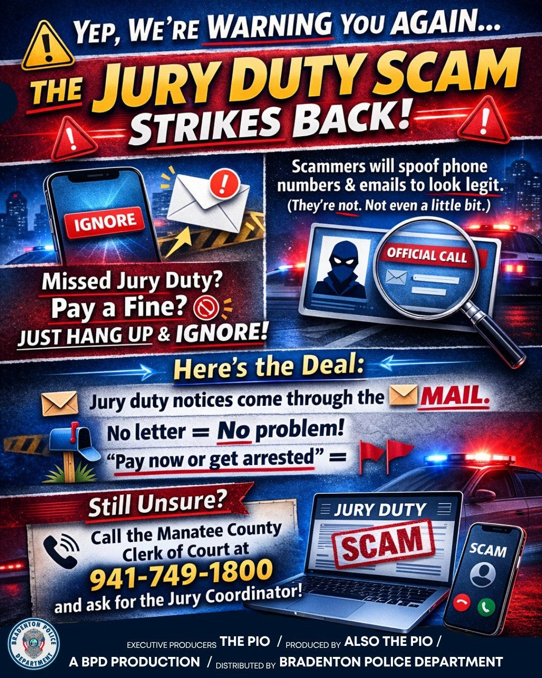 A familiar scam targeting residents with threats tied to missed jury duty has resurfaced in Manatee County, prompting renewed warnings from local authorities.