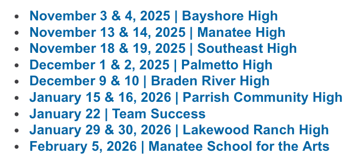 The program will launch November 3–4 at Bayshore High and continue at high schools throughout the county through February 2026. Upcoming sessions include Manatee High, Southeast High, Palmetto High, Braden River High, Parrish Community High, Team Success, Lakewood Ranch High, and Manatee School for the Arts. Additional dates may be available as more charter and private schools join the program.