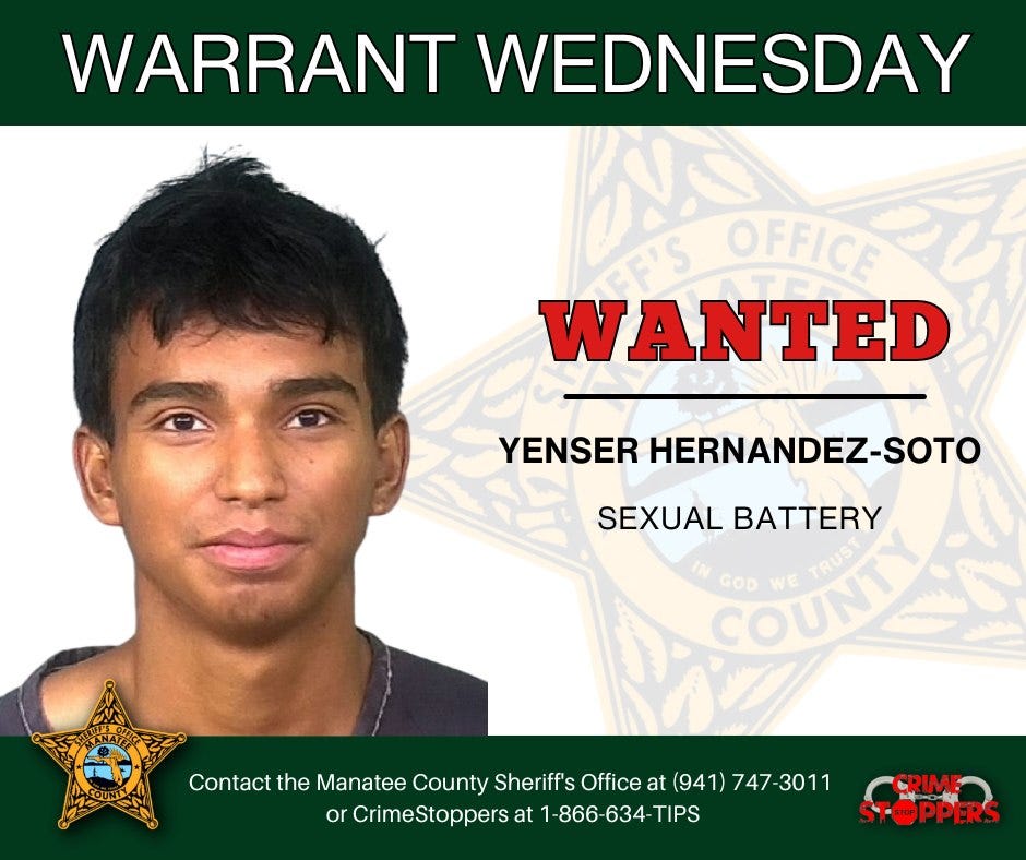 The Manatee County Sheriff’s Office is actively searching for Yenser Hernandez-Soto, who is wanted on a charge of sexual battery.