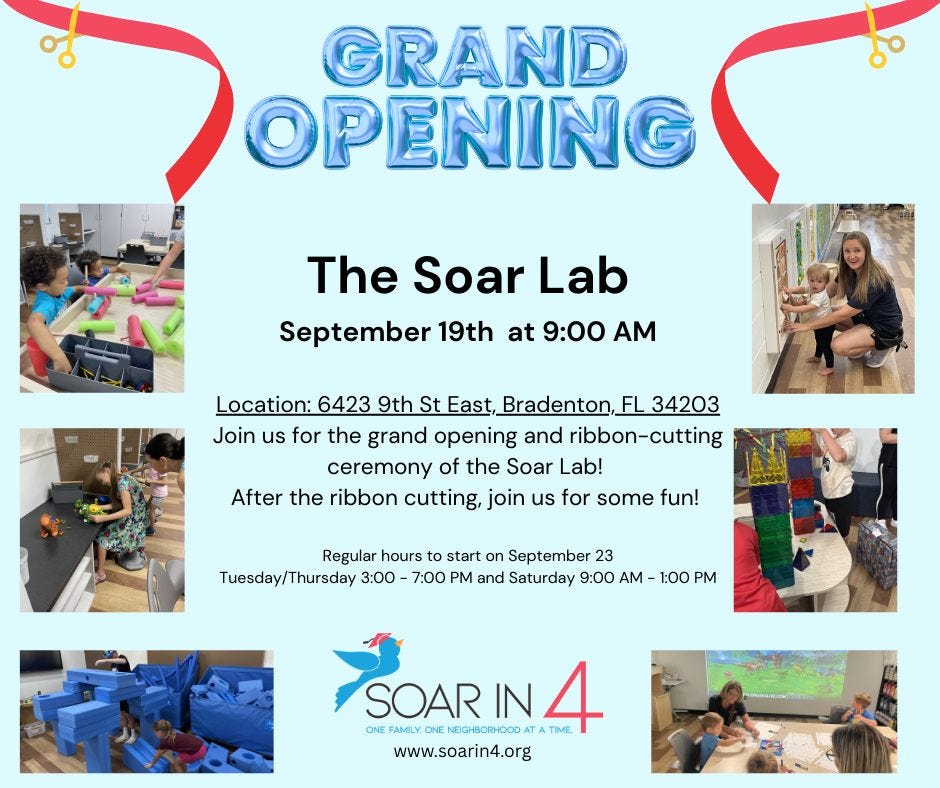 On Friday, September 19, Soar in 4 will unveil its new Soar Lab at 6423 9th Street East in Bradenton. The grand opening and ribbon cutting begin at 9:00 a.m., followed by family activities. Regular lab hours will begin September 23, with programming on Tuesdays, Thursdays, and Saturdays.