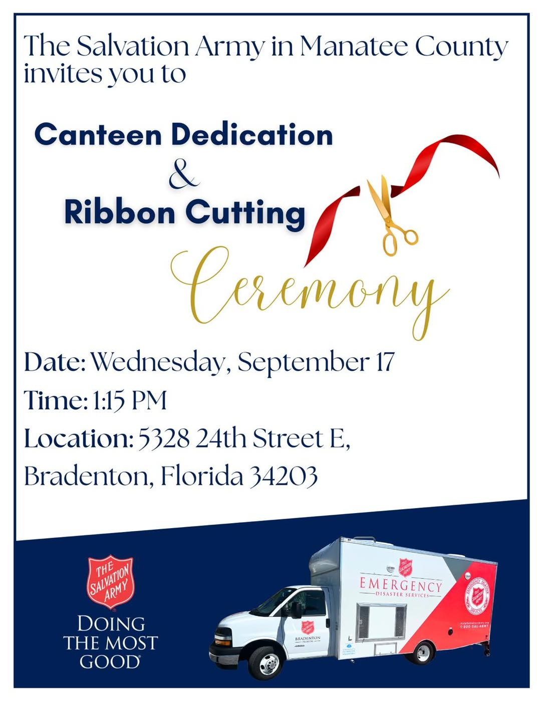 The week begins on Wednesday, September 17, when The Salvation Army in Manatee County hosts a Canteen Dedication and Ribbon Cutting Ceremony at 1:15 p.m. at 5328 24th Street East in Bradenton. The new canteen will support emergency disaster services and community outreach.