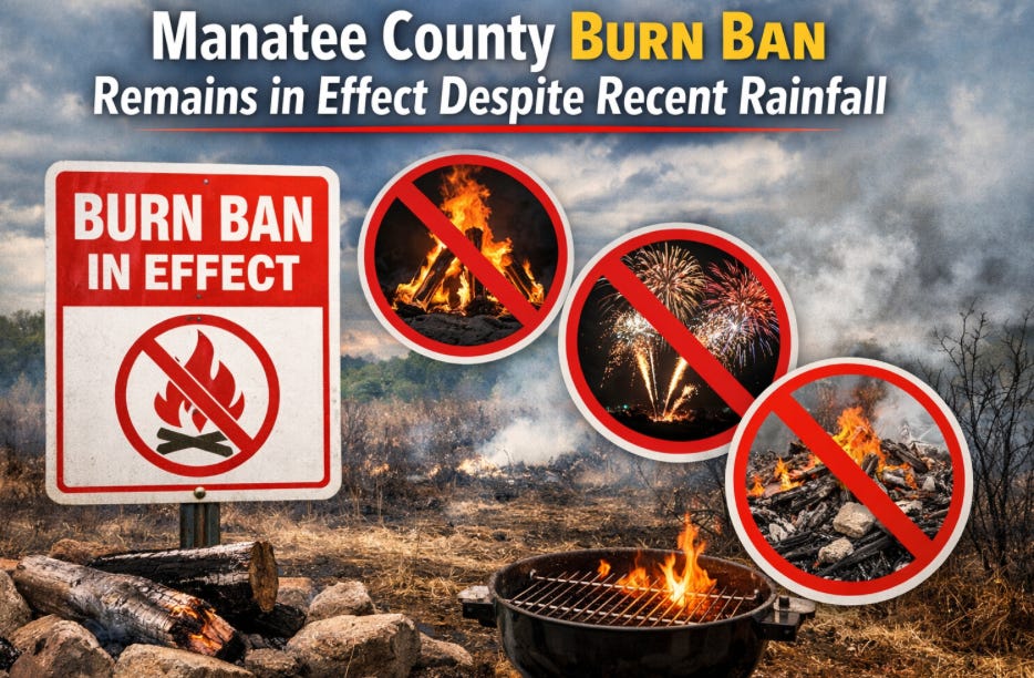 The burn ban will remain in place until it is formally lifted by the Manatee County Board of County Commissioners. County leaders and fire officials are urging residents to continue following the restrictions to help prevent brush fires and protect public safety.