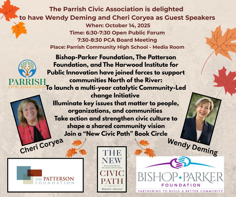 The Parrish Civic Association will host guest speakers Wendy Deming and Cheri Coryea on October 14 from 6:30 to 7:30 p.m. in the Parrish Community High School media room. The open public forum will discuss a new community-led initiative supported by the Bishop-Parker Foundation, The Patterson Foundation, and The Harwood Institute for Public Innovation, focused on strengthening civic engagement north of the river.