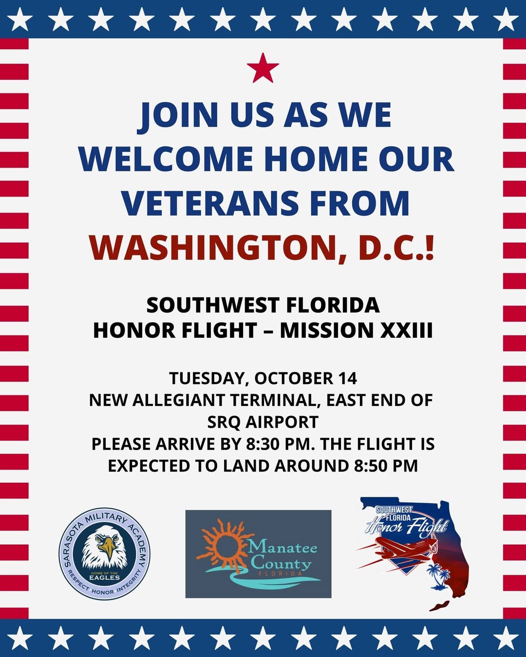 That night also marks the Southwest Florida Honor Flight – Mission XXIII, where residents are encouraged to gather at SRQ Airport’s new Allegiant terminal around 8:30 p.m. to welcome veterans returning from Washington, D.C.