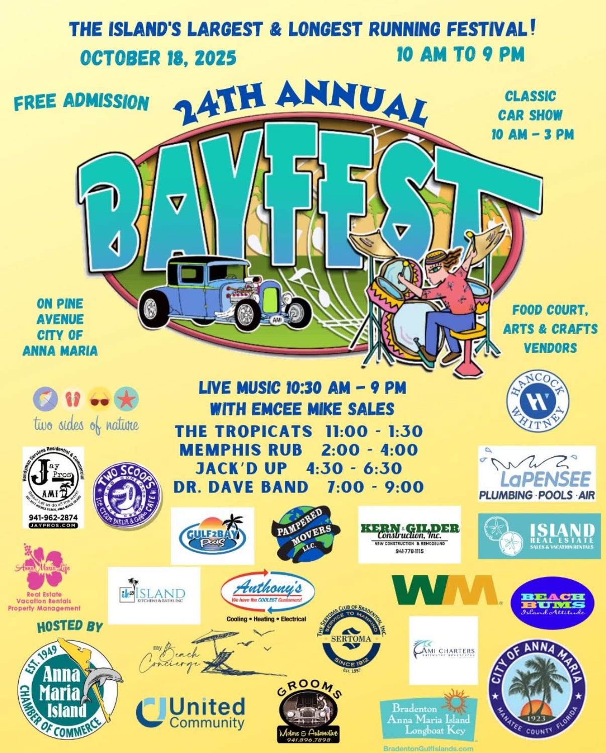 In Anna Maria, the island’s biggest street festival — the 24th Annual BayFest — returns on Saturday, October 18, from 10 a.m. to 9 p.m. along Pine Avenue. The free event includes a classic car show (10 a.m.–3 p.m.), arts and crafts vendors, and live music throughout the day featuring The Tropicats, Memphis Rub, Jack’d Up, and Dr. Dave Band. Hosted by the Anna Maria Island Chamber of Commerce, BayFest draws thousands each year for food, drinks, and local shopping.