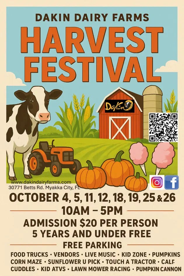 Dakin Dairy Farms Harvest Festival continues its celebration of fall on October 18–19 and 25–26 from 10 a.m. to 5 p.m. at 30771 Betts Road in Myakka City. Families can enjoy food trucks, live music, a kid zone, a corn maze, pumpkin picking, lawn mower racing, a pumpkin cannon, and even calf cuddles. Admission is $20 per person, with children five and under free and free parking on site.