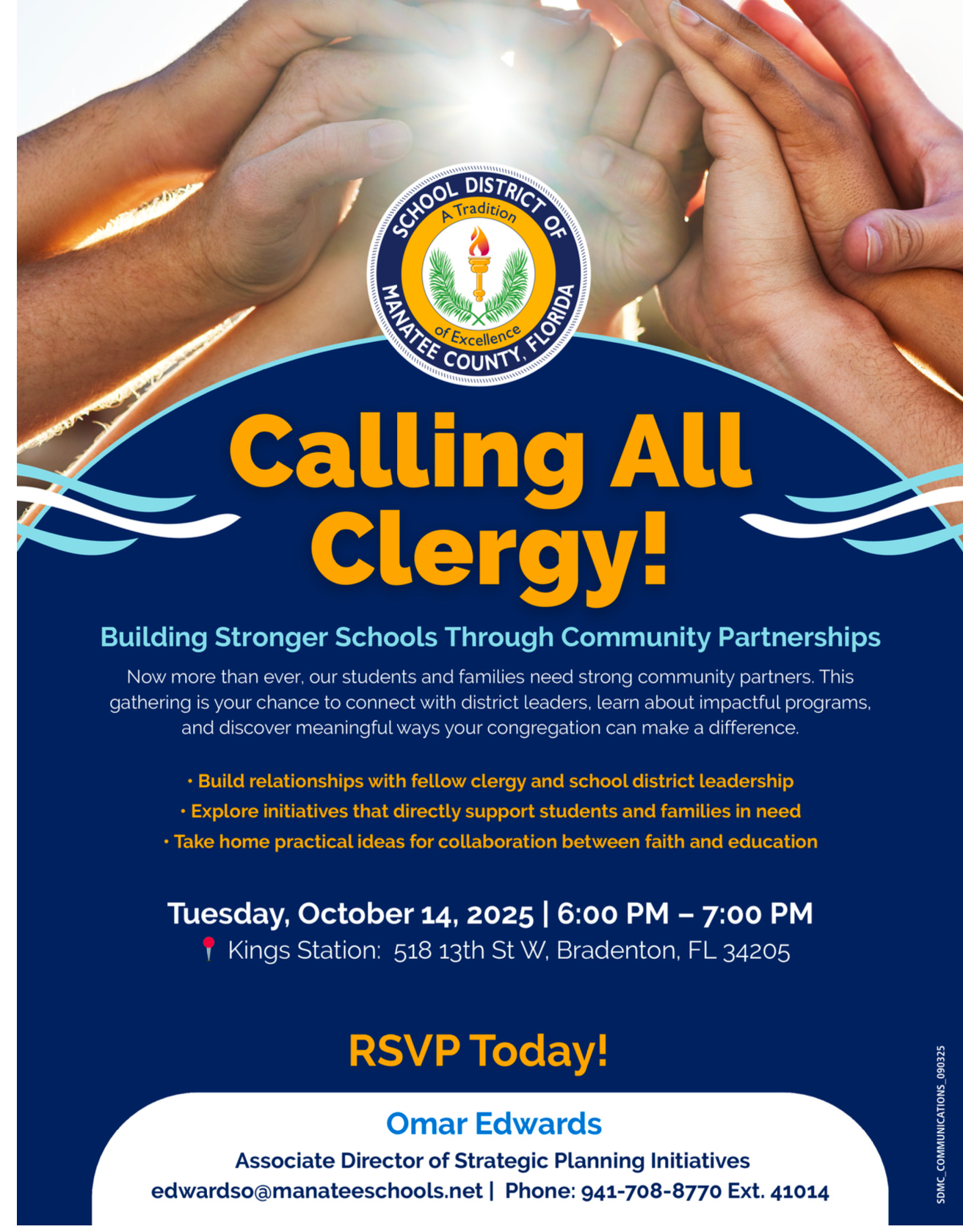 On the same evening, the School District of Manatee County invites faith leaders to its “Calling All Clergy” gathering on Tuesday, October 14, 6 p.m.–7 p.m. at Kings Station (518 13th St. W, Bradenton). The meeting aims to build partnerships between schools and local congregations to better support families and students.