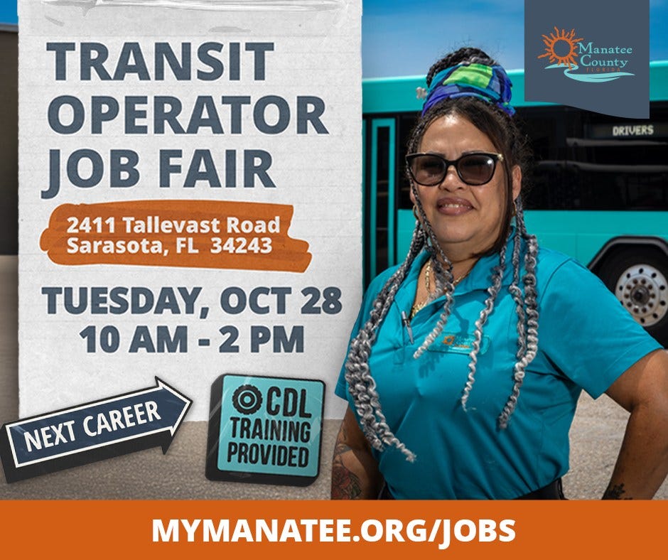 The Manatee County Transit Division hosts a Transit Operator Job Fair from 10 a.m. – 2 p.m. at 2411 Tallevast Road, Sarasota. CDL training is provided for new hires.