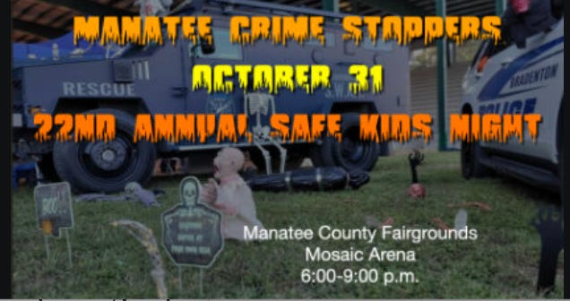 Families can also stop by the Manatee Crime Stoppers Safe Kids Night at the Manatee County Fairgrounds Mosaic Arena from 6 p.m. – 9 p.m. for a safe trick-or-treating experience.