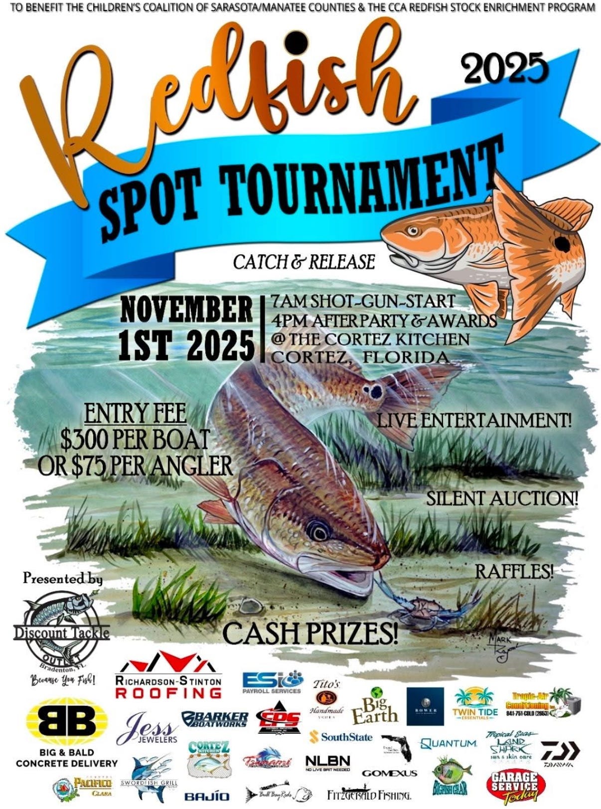 Also that morning, anglers will cast off in the Redfish Spot Tournament in Cortez Village to benefit the Children’s Coalition of Sarasota/Manatee Counties and the CCA Redfish Stock Enrichment Program.