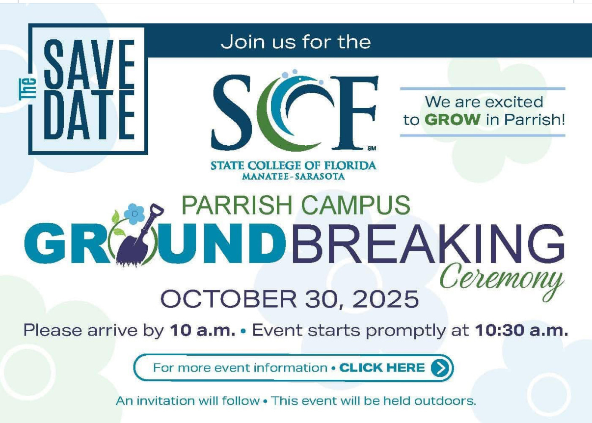The State College of Florida will host a groundbreaking ceremony for its new Parrish Campus on Thursday at 10:30 a.m.
