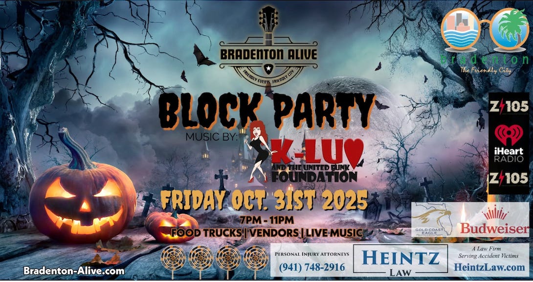 Downtown Bradenton comes alive with the Bradenton Alive Halloween Block Party from 7 p.m. – 11 p.m. on Old Main Street, complete with food trucks, live music, and costumes.