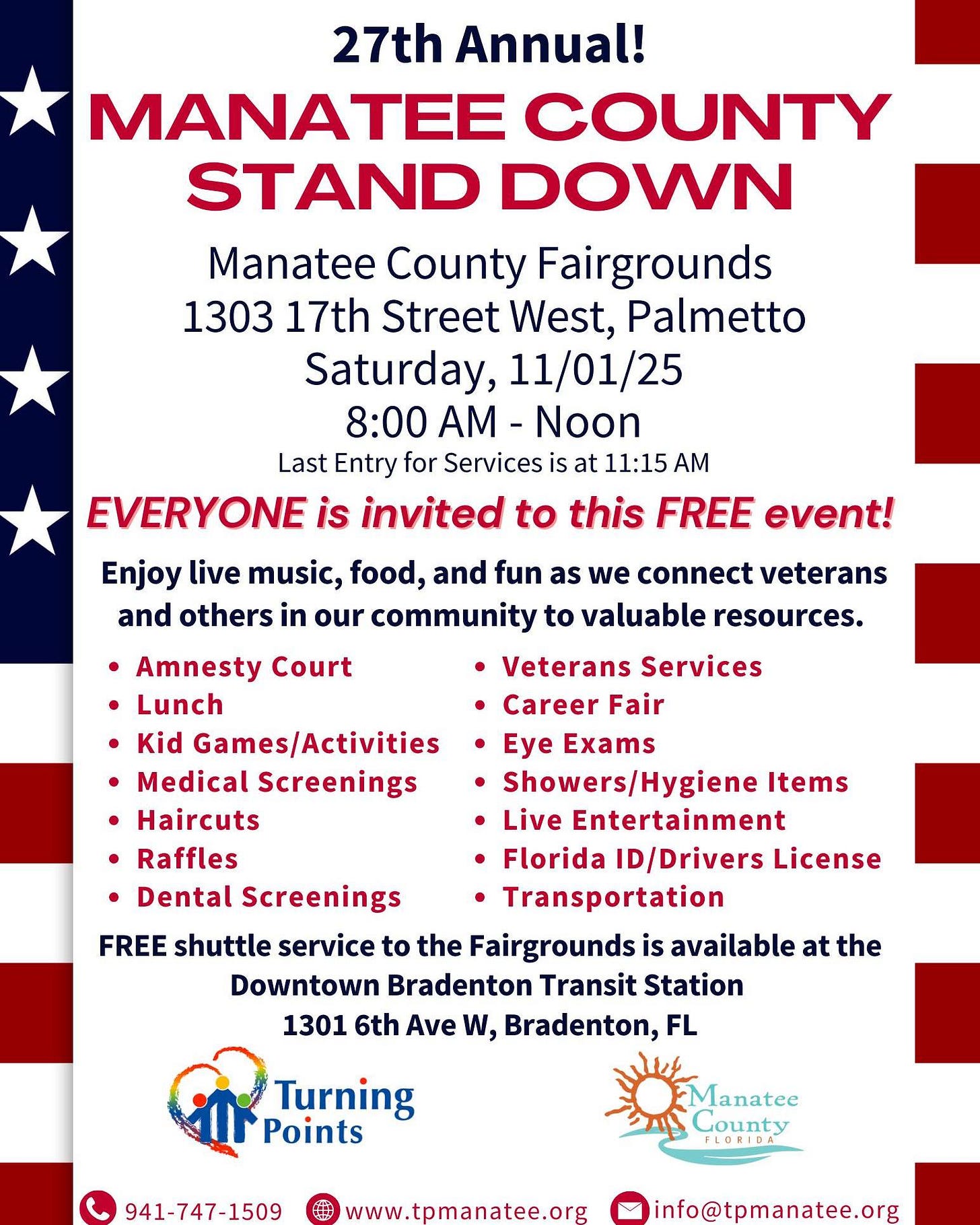 The 27th Annual Manatee County Stand Down takes place from 8 a.m. – noon at the Manatee County Fairgrounds in Palmetto. The free event connects veterans and community members to critical services such as healthcare screenings, career resources, and legal aid.
