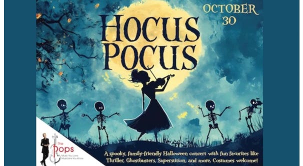 The evening also brings music and Halloween magic to the Riverview Performing Arts Center, where The Pops Orchestra presents a Hocus Pocus Concert featuring spooky favorites such as Thriller and Ghostbusters.