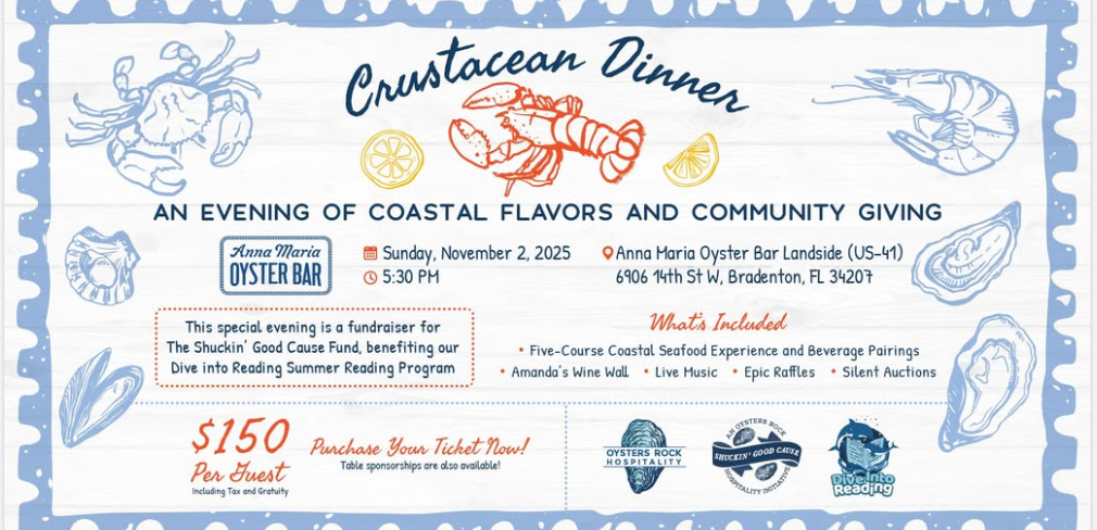 Anna Maria Oyster Bar Landside will host the Crustacean Dinner, a five-course coastal seafood fundraiser benefiting the Dive Into Reading summer literacy program. The event begins at 5:30 p.m. and includes live music, raffles, and wine pairings.