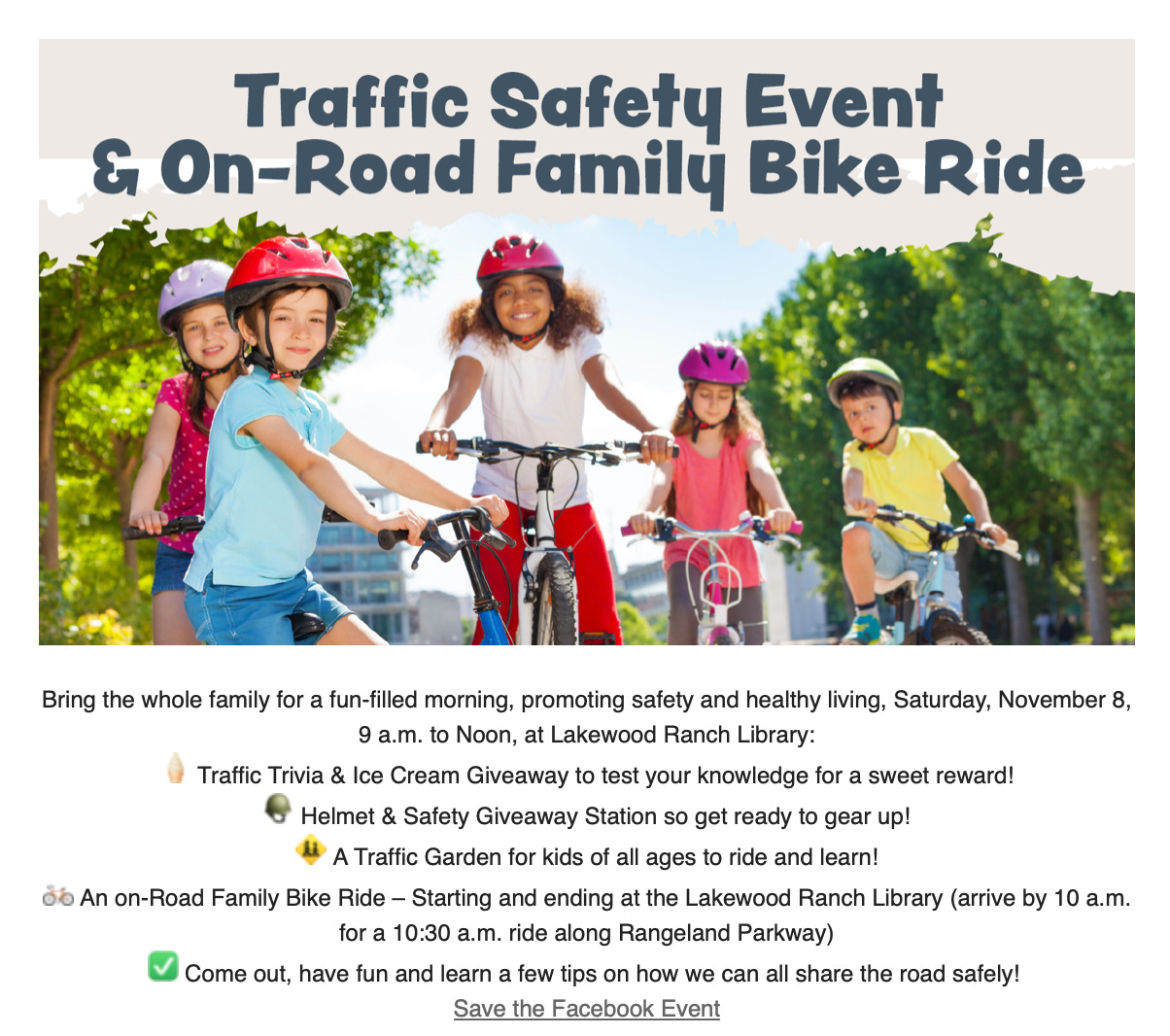 Kids’ traffic garden, helmet giveaways, trivia with prizes, and on-road family ride led by Manatee County Public Works.