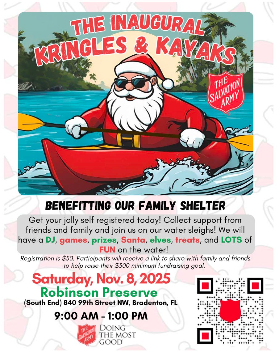 A jolly paddle fundraiser hosted by The Salvation Army Bradenton. DJ, Santa, games, and holiday prizes—all supporting the Family Shelter.