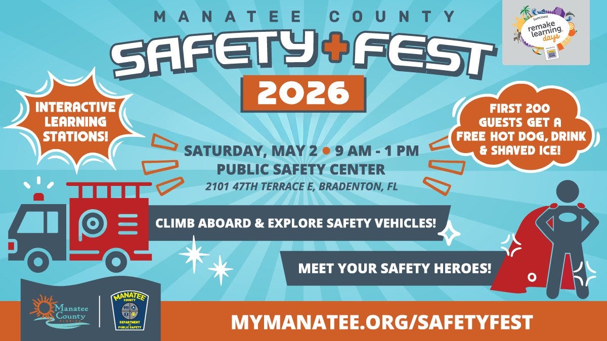 Families looking for interactive experiences can attend the Manatee County Safety Fest on Saturday, May 2, from 9 a.m. to 1 p.m. at the Public Safety Center in Bradenton. The event features hands-on learning stations, opportunities to explore emergency vehicles and meet first responders. The first 200 attendees receive complimentary refreshments, adding to the event’s appeal for families with young children.