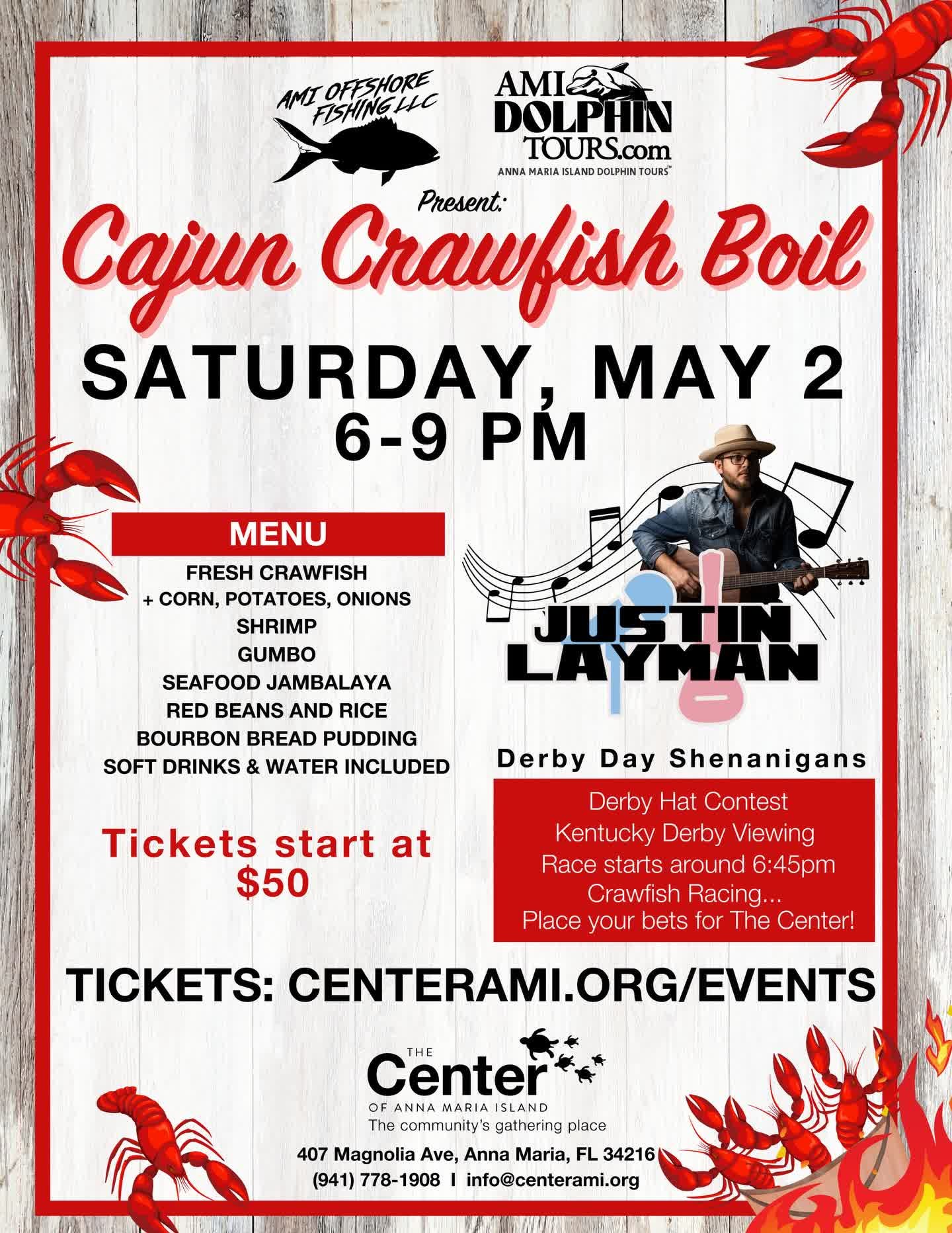 Also on May 2, The Center of Anna Maria Island will host a Cajun Crawfish Boil from 6 p.m. to 9 p.m. The event combines food, live music and Kentucky Derby-themed activities, including a hat contest and race viewing. The gathering serves as both a social event and a fundraiser, offering a festive atmosphere with traditional Southern cuisine.