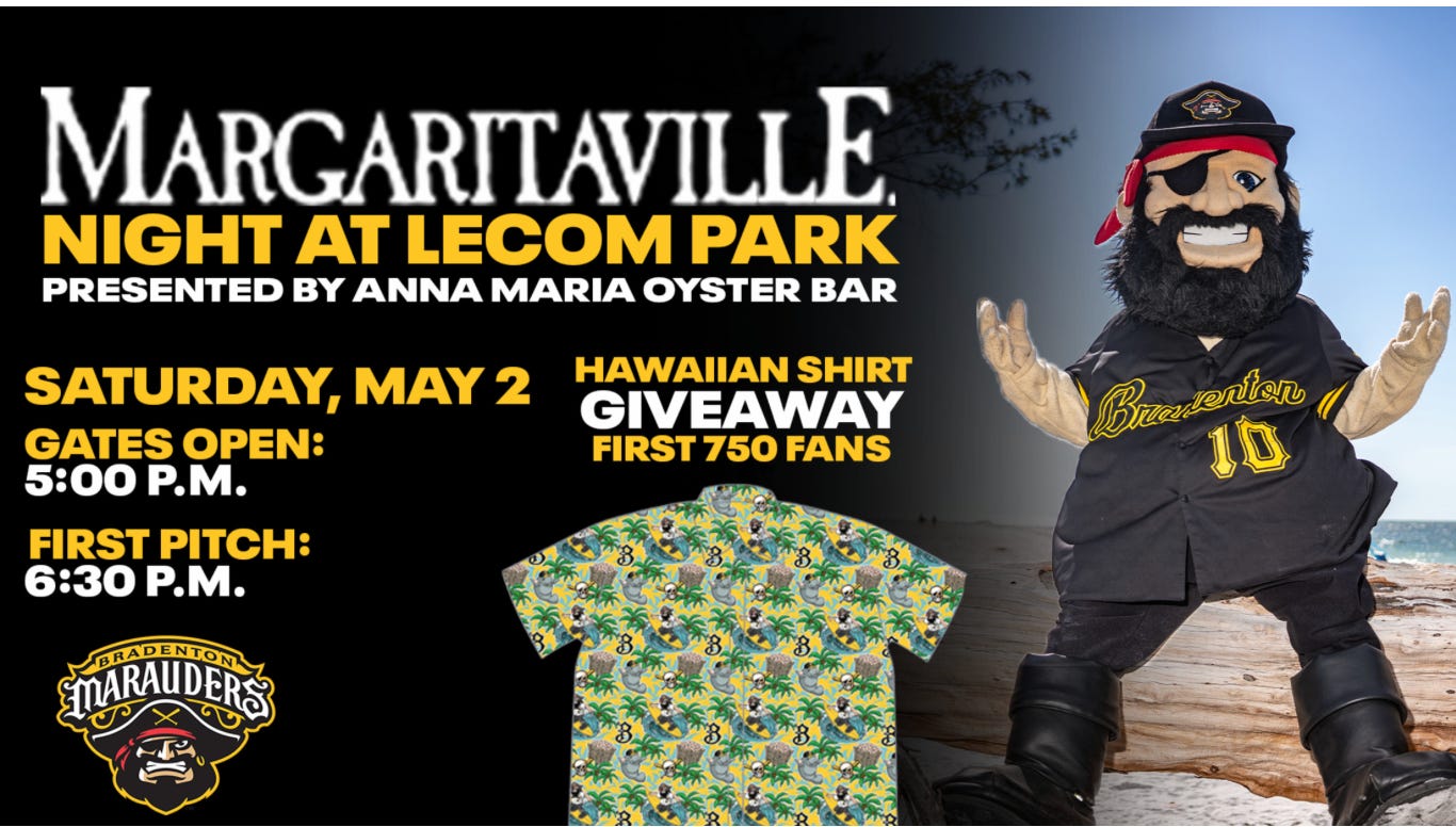 In addition to these events, the Bradenton Marauders will host Margaritaville Night on Saturday, May 2 at LECOM Park. Gates open at 5 p.m., with first pitch scheduled for 6:30 p.m. The themed evening will feature a Hawaiian shirt giveaway for the first 750 fans, adding a festive, beach-inspired atmosphere to the game. The promotion is part of the team’s 2026 season lineup, which continues to draw families and baseball fans to the ballpark with a mix of entertainment and community-focused events.