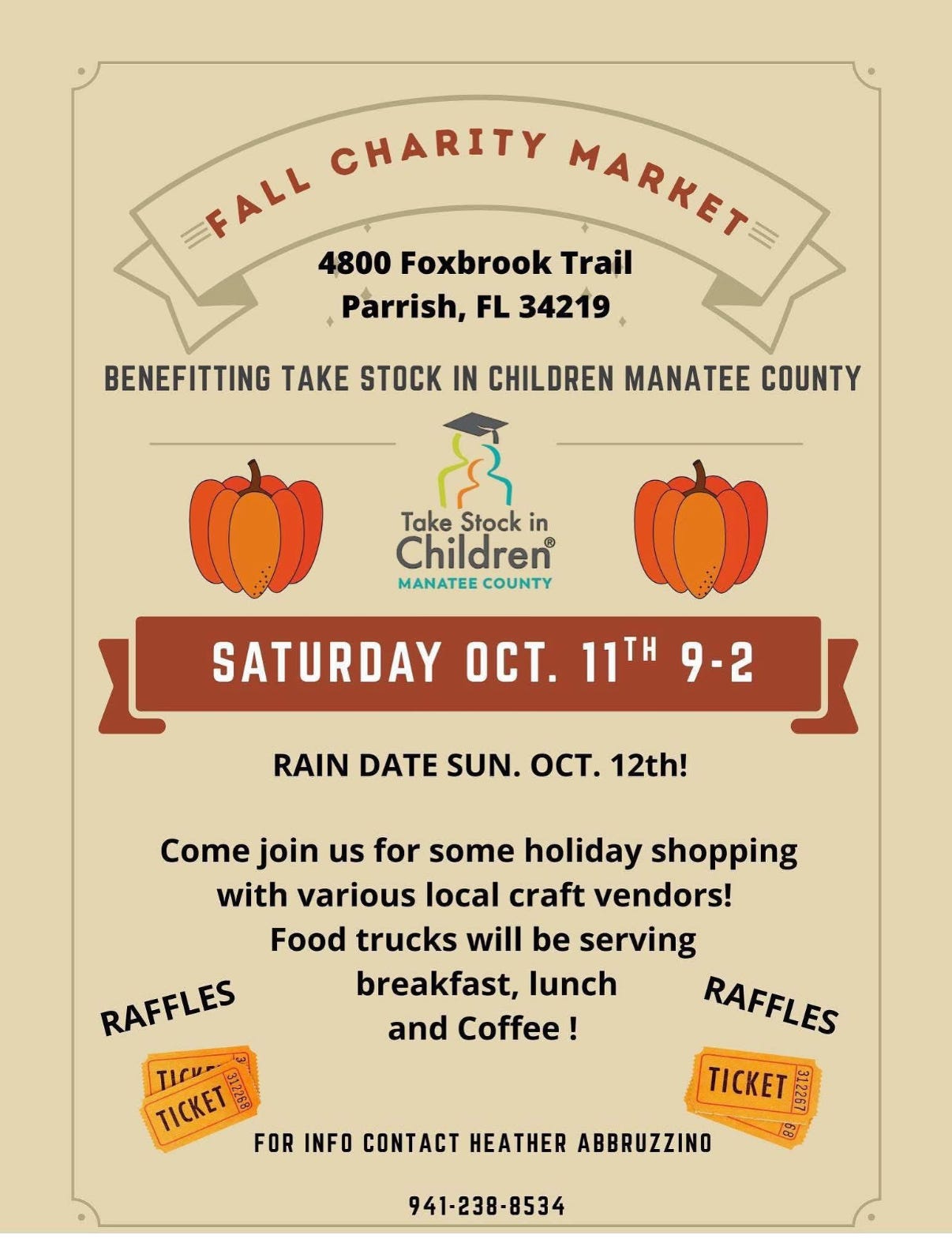Featuring local craft vendors, raffles, and food trucks serving breakfast, lunch, and coffee. Proceeds benefit Take Stock in Children Manatee County. (Rain date: October 12)
