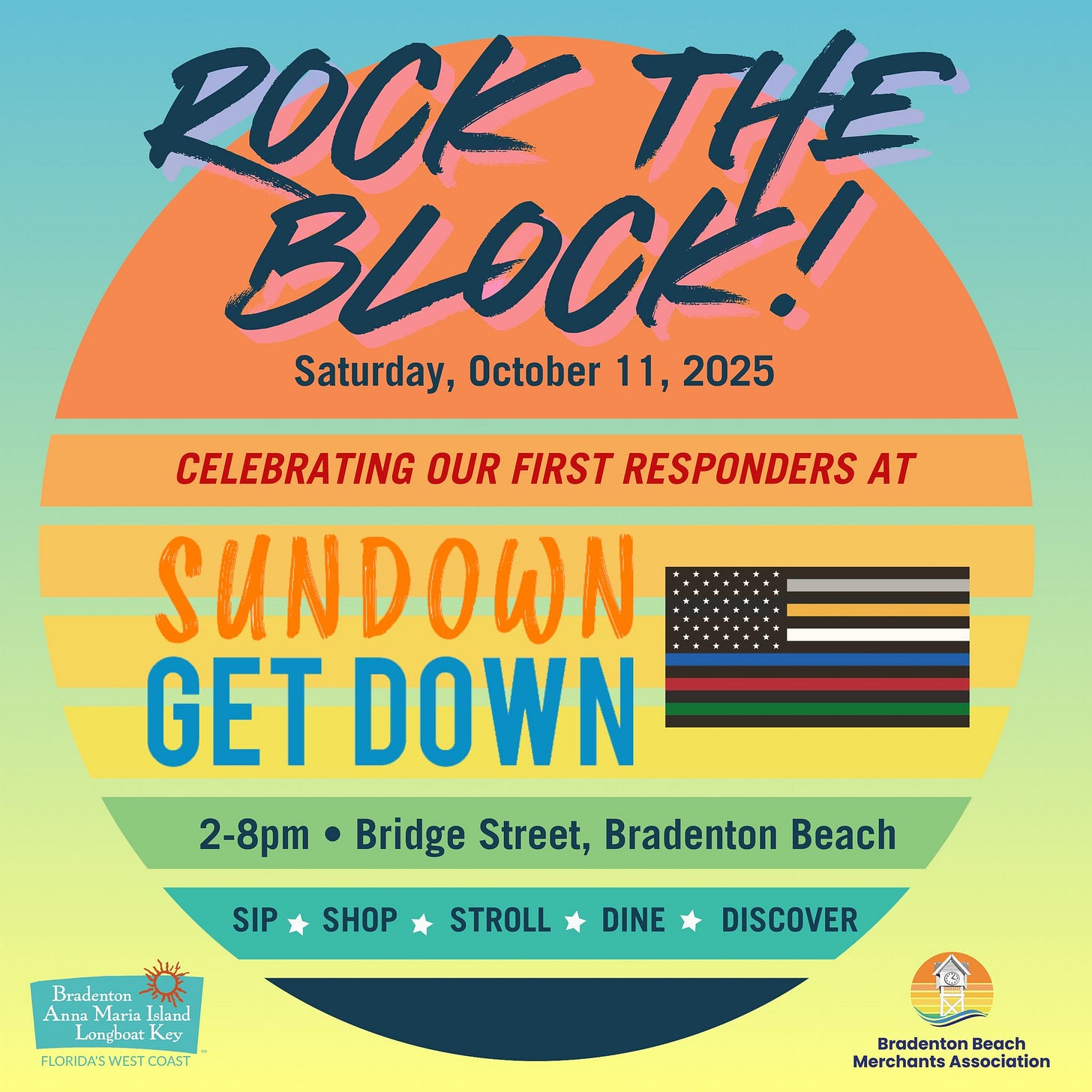 The Bradenton Beach Merchants Association celebrates first responders with live music, food, and shopping in a festive street party atmosphere.