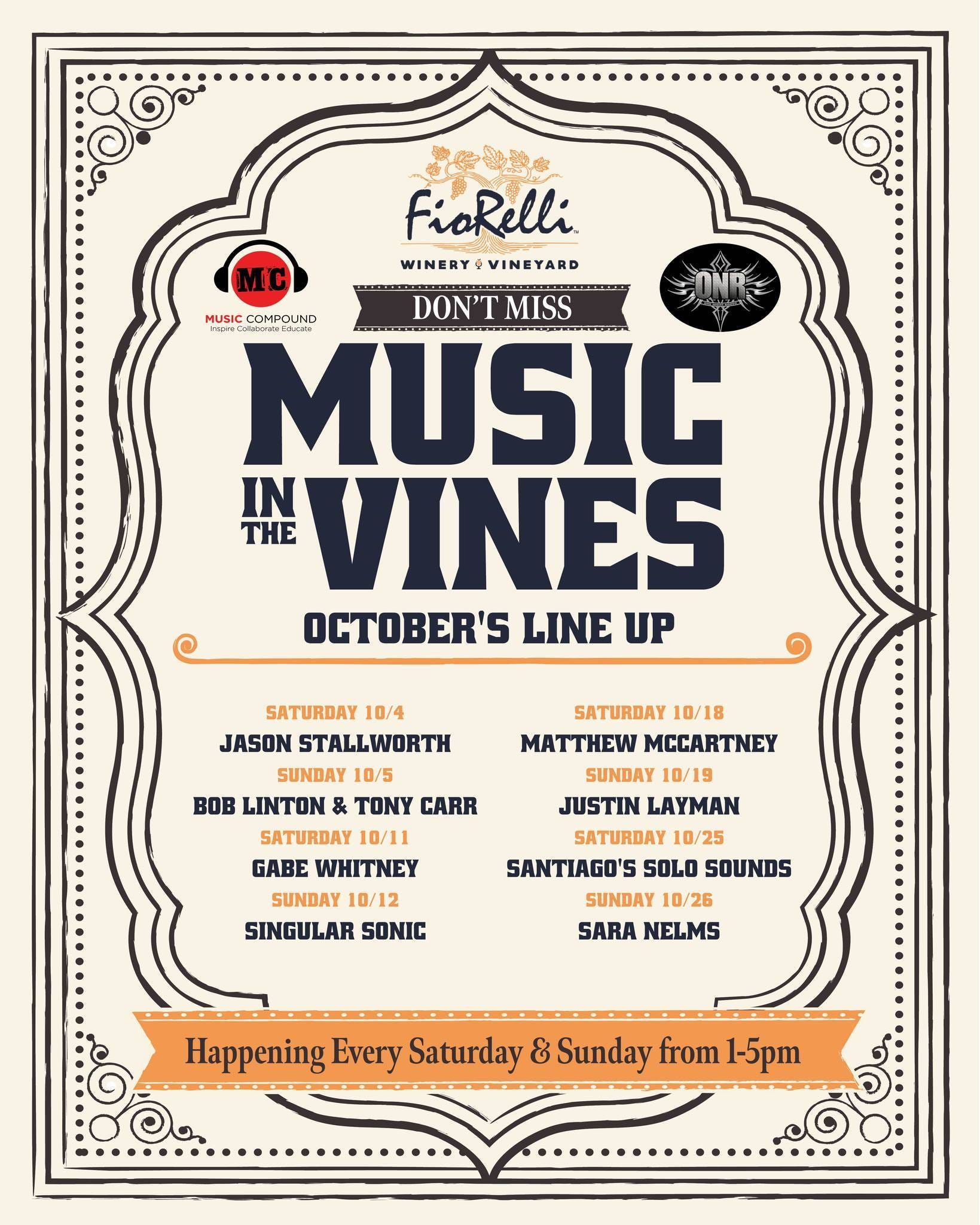 Part of the October weekend music series, enjoy live performances by Gabe Whitney and Singular Sonic in a relaxed vineyard setting.