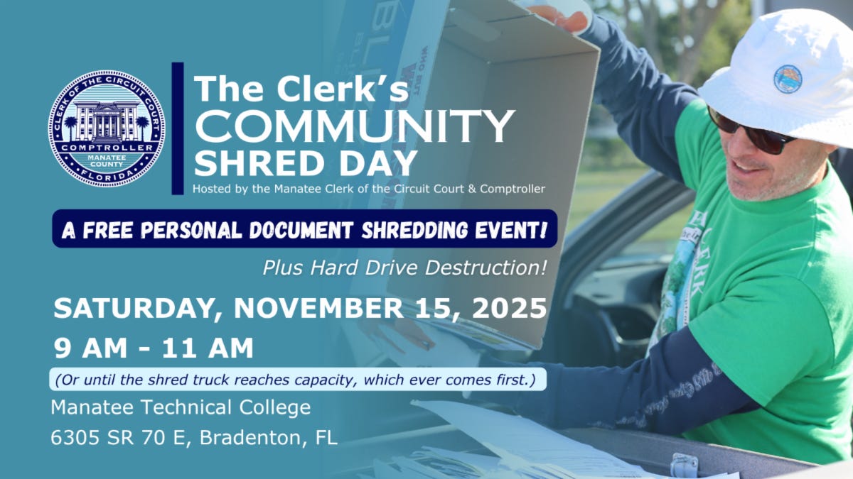 The Clerk’s Community Shred Day, hosted by the Manatee Clerk of Court & Comptroller, runs 9 a.m.–11 a.m. at Manatee Technical College, offering free document shredding and hard-drive destruction.