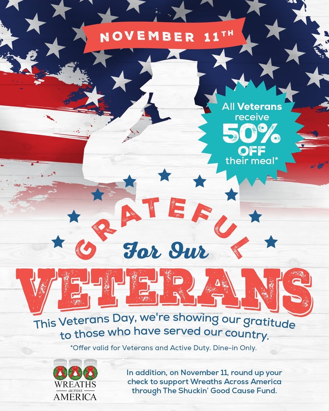 Restaurants across the county are also showing their gratitude. Participating locations, such as The Shuckin’ Shack, will offer 50% off meals to veterans and active-duty service members, with proceeds supporting Wreaths Across America.