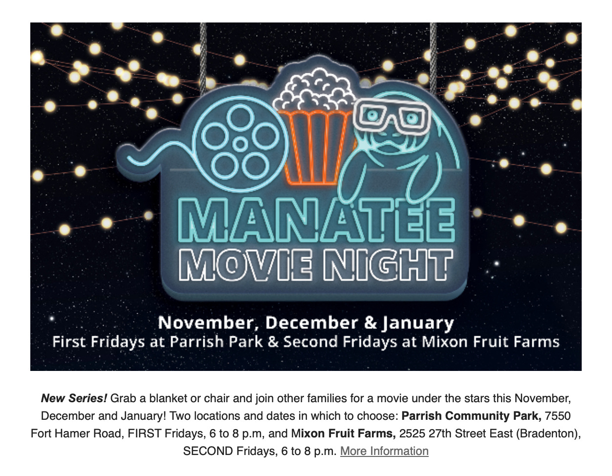 At Mixon Fruit Farms in Bradenton, families can enjoy Movies in the Park from 6 to 8 p.m., part of a monthly outdoor film series.