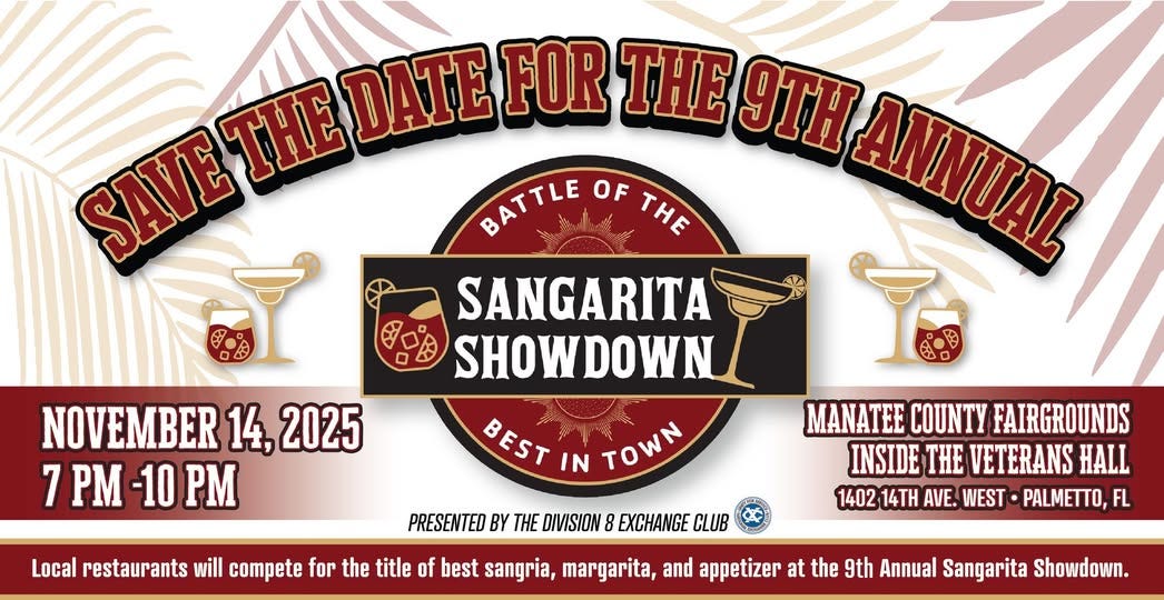 The 9th Annual Sangarita Showdown (7 p.m.–10 p.m.) inside the Veterans Hall at the Manatee County Fairgrounds, where restaurants compete for the best sangria, margarita, and appetizer.