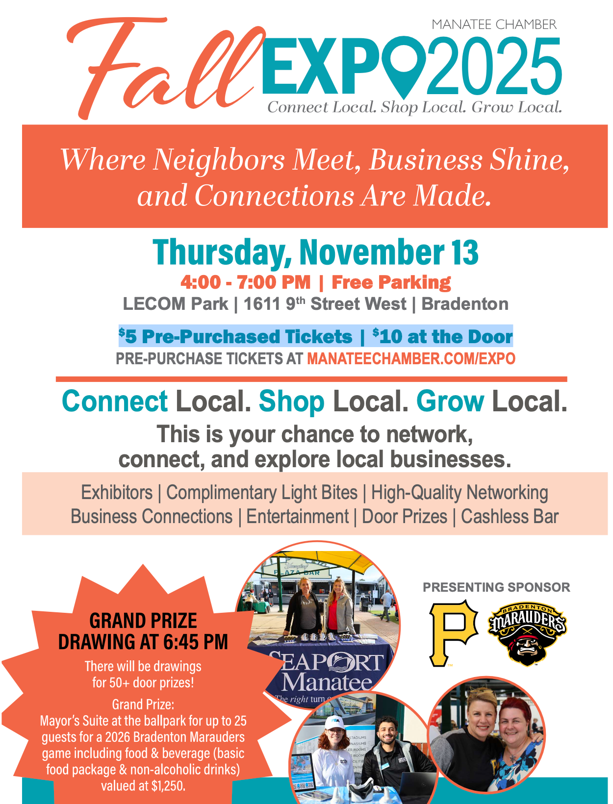 The Manatee Chamber of Commerce Fall Expo 2025 follows on Thursday, November 13, from 4 p.m. to 7 p.m. at LECOM Park in Bradenton. The event will feature 100+ local exhibitors, networking opportunities, entertainment, and a grand prize drawing for a Bradenton Marauders suite package.